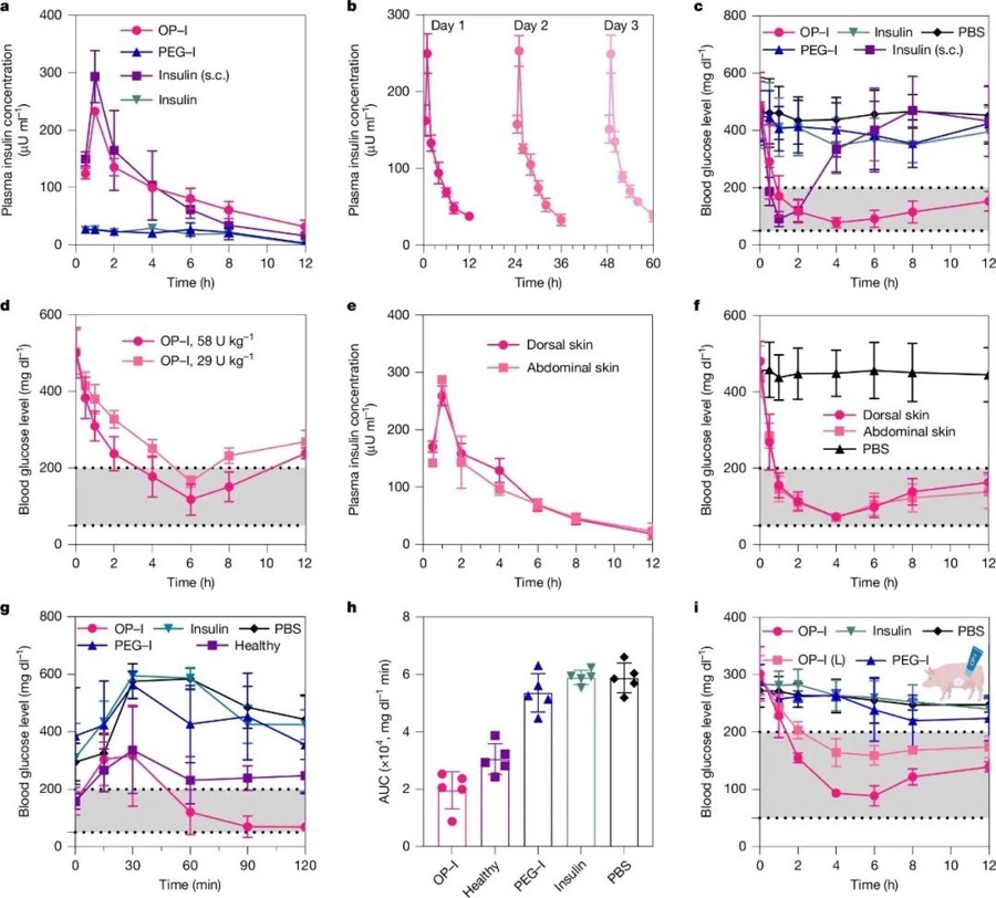 具体而言,对STZ(链脲佐菌素,一种常见诱导素)诱导糖尿病小鼠经皮给予116U/kg OP-I,血糖在1h内即可快速降至正常范围,降糖效果与皮下注射胰岛素相当,药效持续时间延长至12h以上且无低血糖风险。SPR(表面等离子体共振)实验进一步表明,OP-I与胰岛素受体的结合能力与天然胰岛素相当;对于皮肤结构更接近人类的糖尿病迷你猪,仅需29U/kg的经皮给药剂量,即可实现血糖正常化。