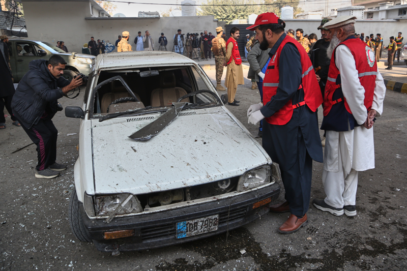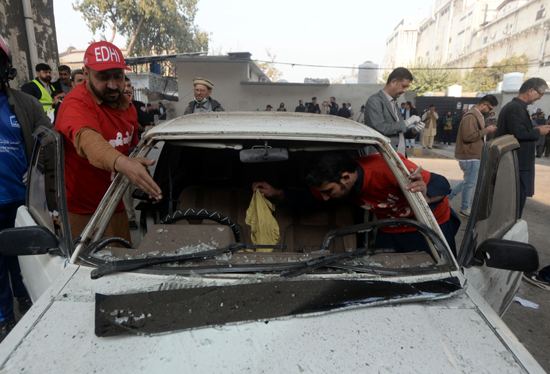 11月24日,在巴基斯坦白沙瓦,救援人员检查自杀式爆炸袭击现场一辆损毁的汽车。