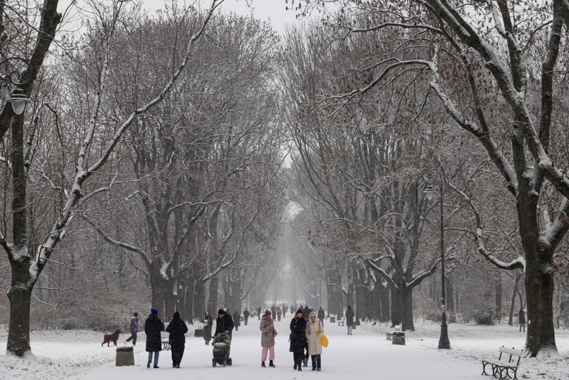11月23日,在波兰华沙,人们在雪中漫步。