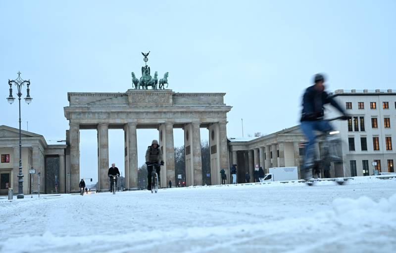 11月24日,在德国柏林勃兰登堡门,人们骑车出行。