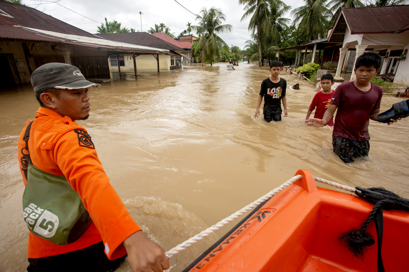 11月24日,在印度尼西亚西苏门答腊省,人们在洪水中行走。