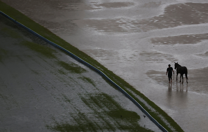 11月24日,在马来西亚吉隆坡,一名男子撑伞牵马在雨中前行。